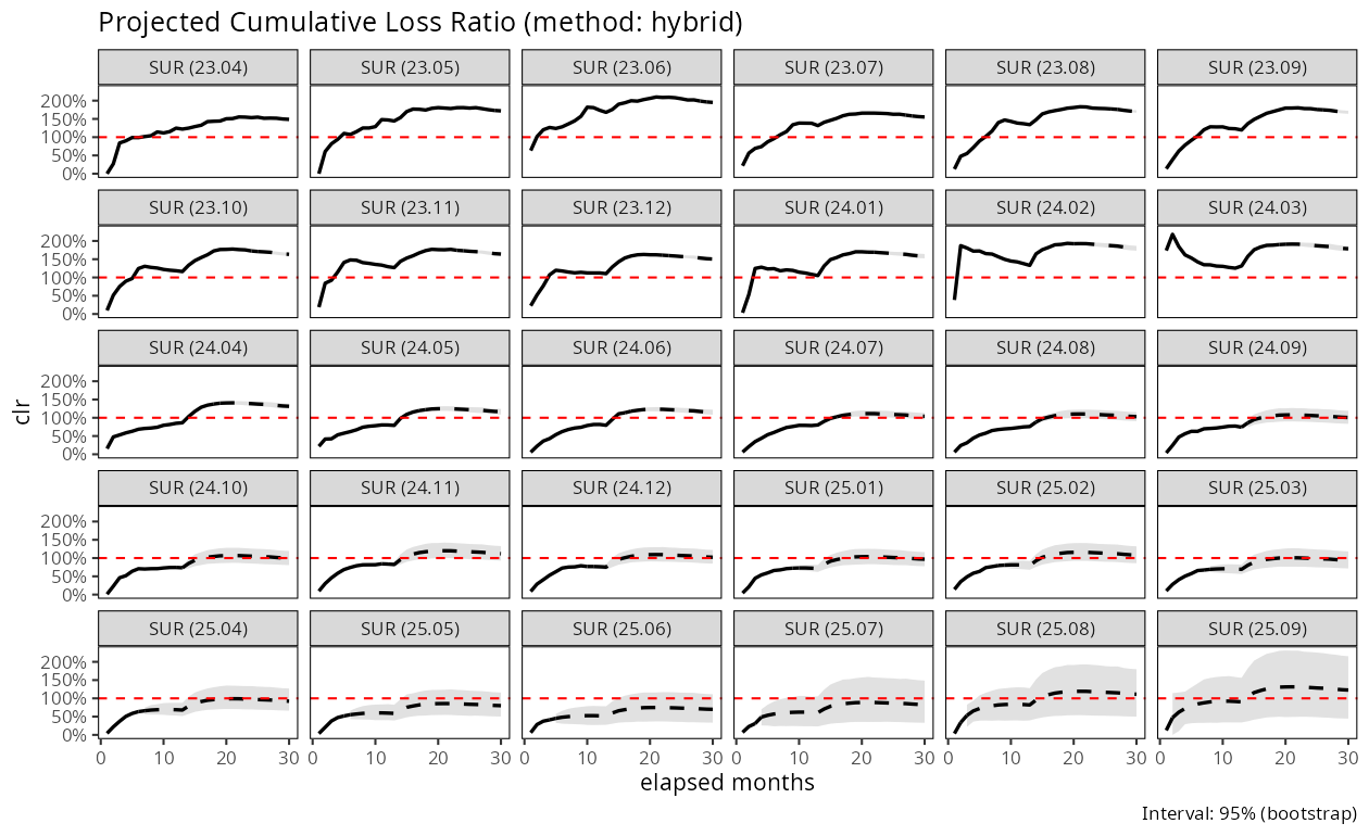 plot(fit, type = "clr") # 신뢰구간이 포함된 예측 손해율