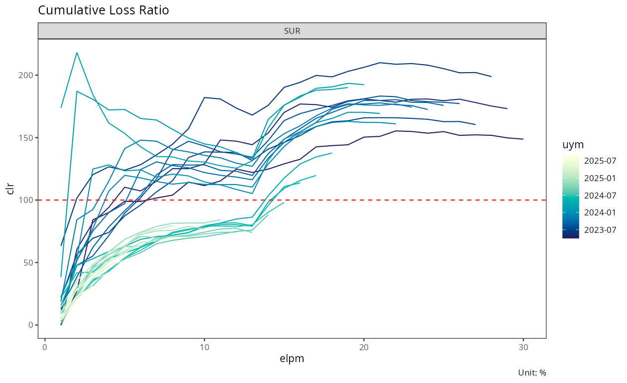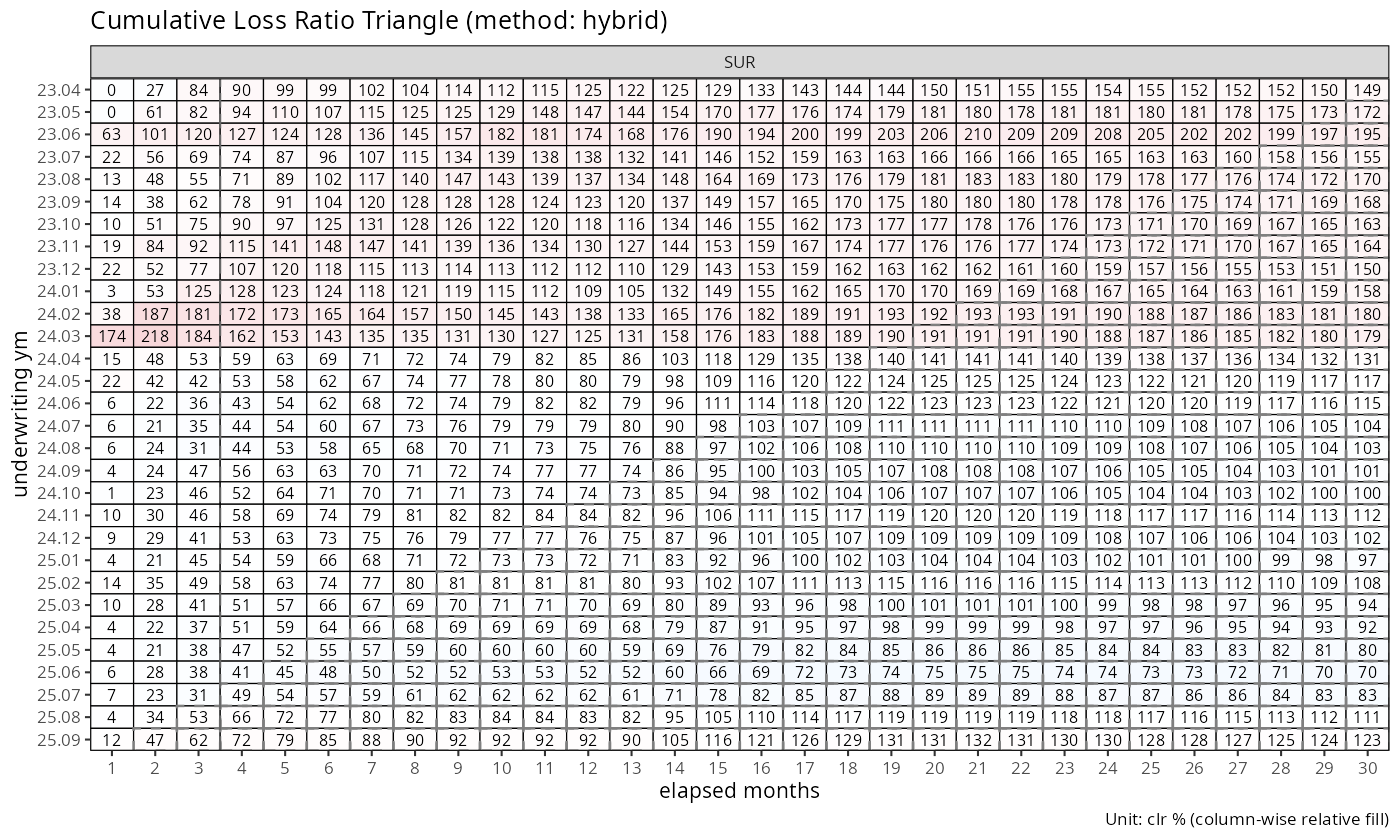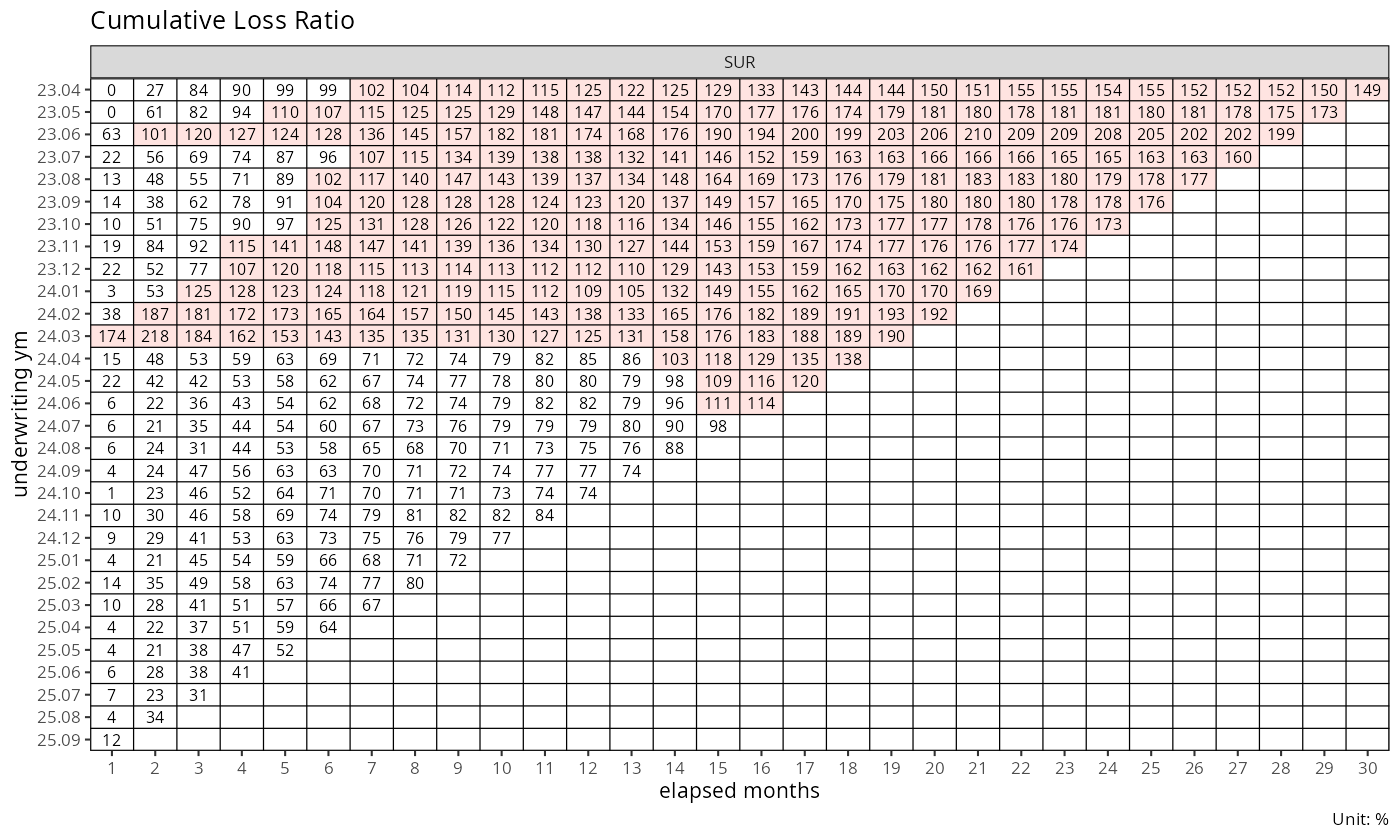 dev_sur <- build_dev(data[cv_nm == "SUR"], cv_nm)결과로 얻는 dev 객체는 각 코호트-경과 쌍에 대해 누적 손해액 \(C^L_{i,k}\), 누적 보험료 \(C^P_{i,k}\), 증분 손해액 \(\Delta C^L_{i,k+1}\), 손해율 \(clr_{i,k}\)를 보유한다.