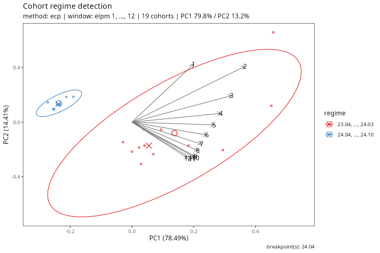 r <- detect_cohort_regime(dev_sur, K = 12, method = "ecp")