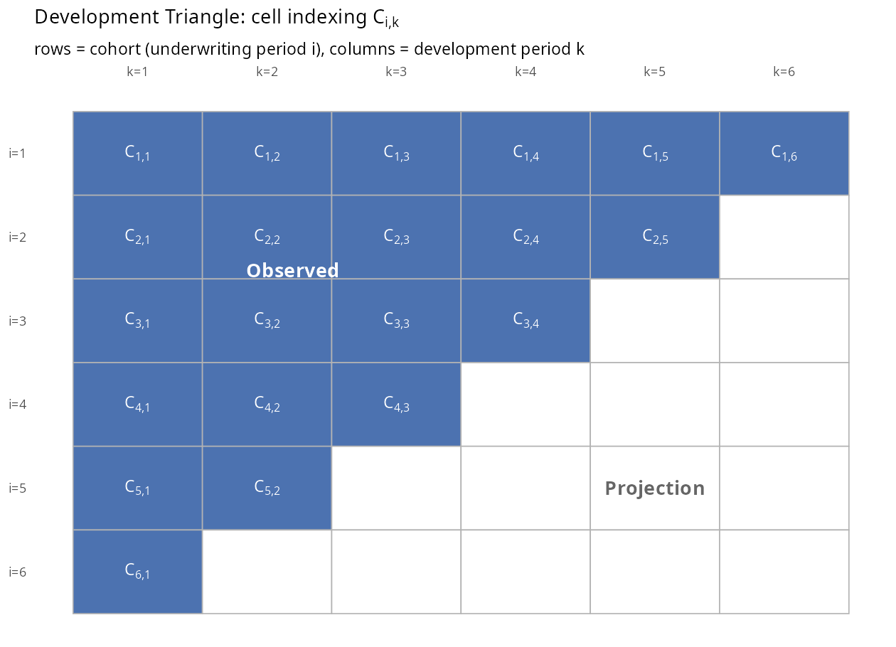 이후 전개되는 수식은 모두 Triangle의 셀 \(C_{i,k}\)에 대한 것이다. 행 \(i\)는 인수 코호트(예: 인수월), 열 \(k\)는 경과 기간(예: 경과월)을 나타내며, 좌상단의 채워진 영역은 관측된 경험, 우하단의 빈 영역은 예측으로 채워야 할 셀이다. 이후 등장하는 \(C^L_{i,k}\)(누적 손해액)와 \(C^P_{i,k}\)(누적 위험보험료)는 같은 \((i,k)\) 좌표 위에 값만 달리해 올린 두 개의 Triangle(누적 손해액 Triangle, 누적 위험보험료 Triangle)로 이해하면 된다.